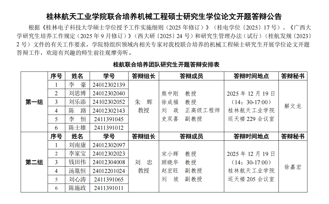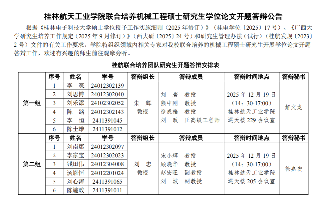 桂林航天工业学院联合培养2024级机械工程硕士研究生学位论文开题答辩公告