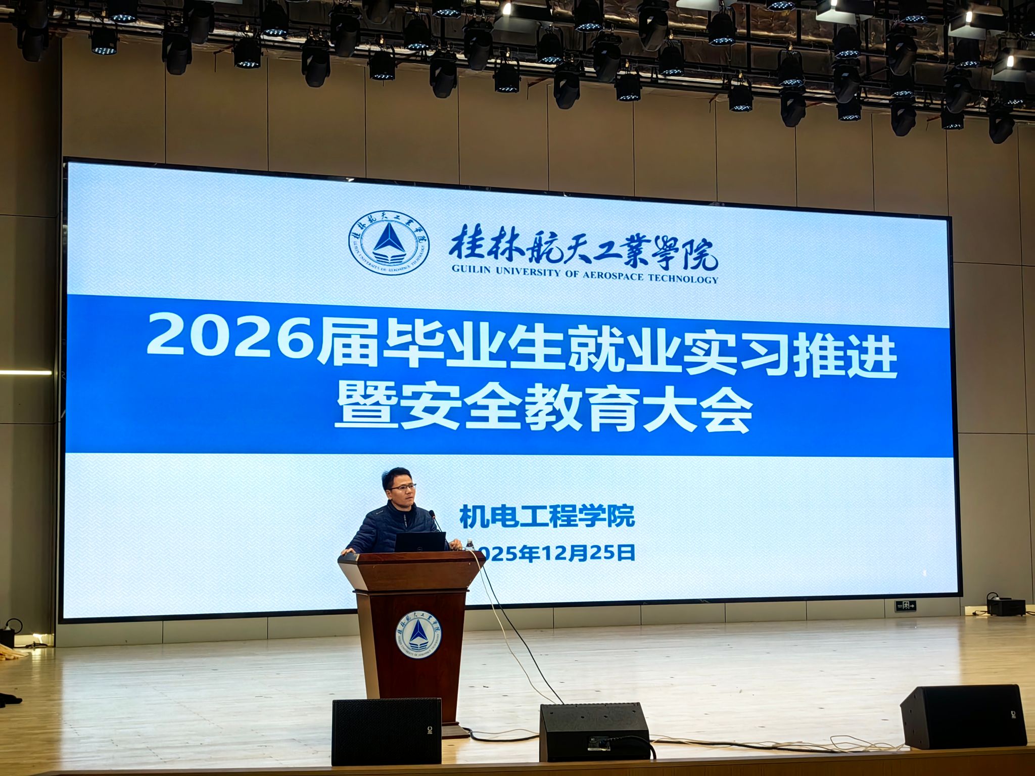12月25日,机电工程学院在问天楼学术报告厅召开2026届毕业生就业实习推进暨安全教育大会。学院党委副书记陆宇川、副院长熊中刚、全体毕业班辅导员及800余名2026届毕业生参会。会议旨在科学部署实习就业关键节点,强化安全风险防范意识,为毕业生顺利步入职场奠定坚实基础。