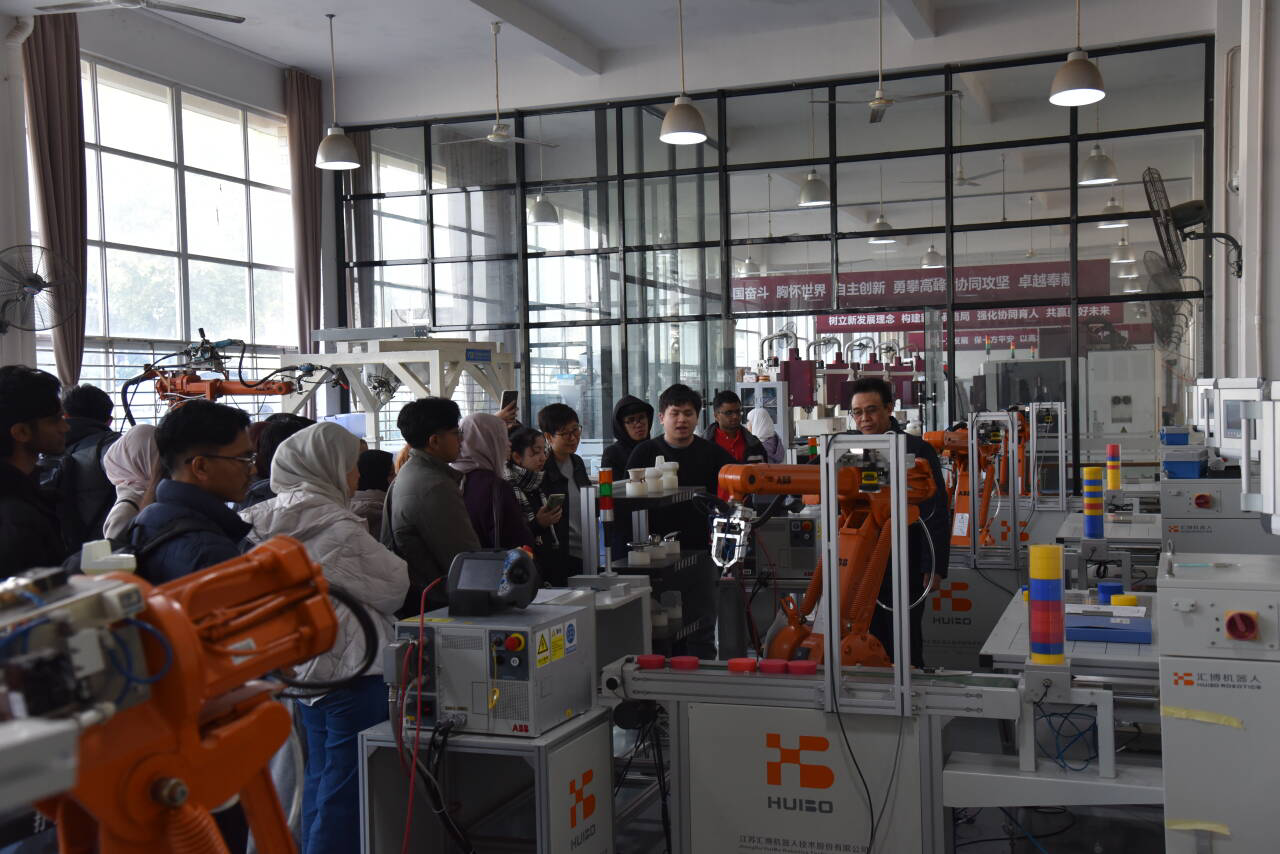 随后,代表团实地参观了我院机械工程实训中心,先进的数控加工设备、高端的工业机器人及精尖的智能制造设备,引发了交流团学生的浓厚兴趣,他们不时驻足观察、积极提问交流,充分感受到机电工程学院在实验室建设、产教融合、技术创新的最新成果及“中国智造”的数字化魅力。