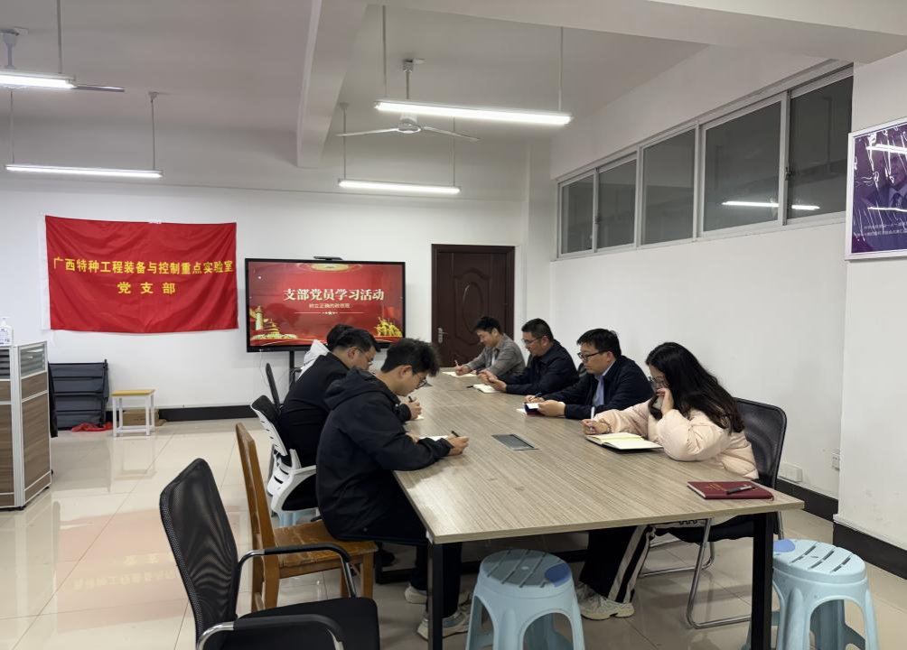 成立仪式后,广西特种工程装备与控制重点实验室党支部随即开展首次党员学习活动,以“第一议题”学习为抓手,强化党员思想建设。学习活动由支部书记刘忠教授领学,组织召开“牢固树立和践行正确政绩观”集体学习会。