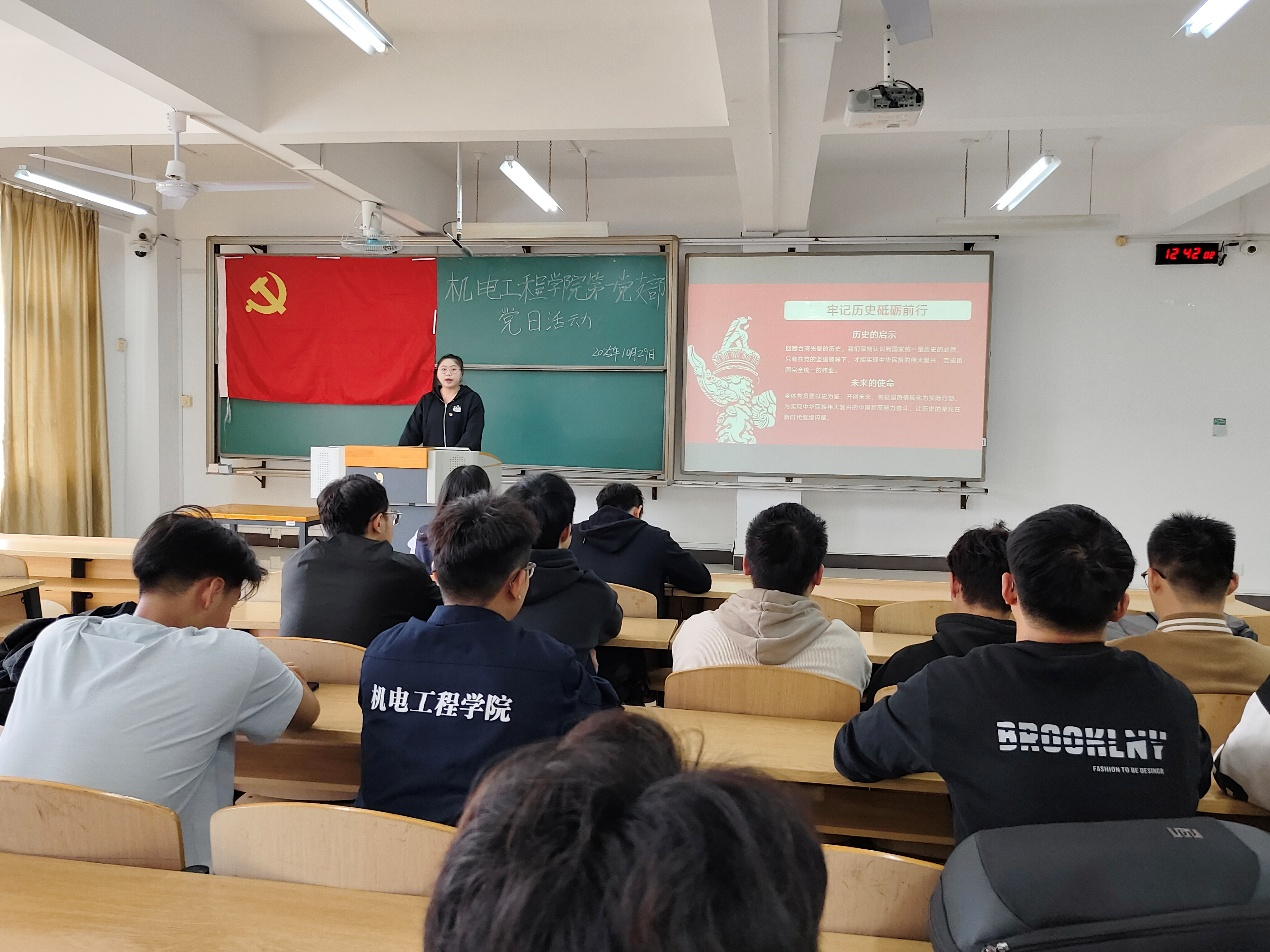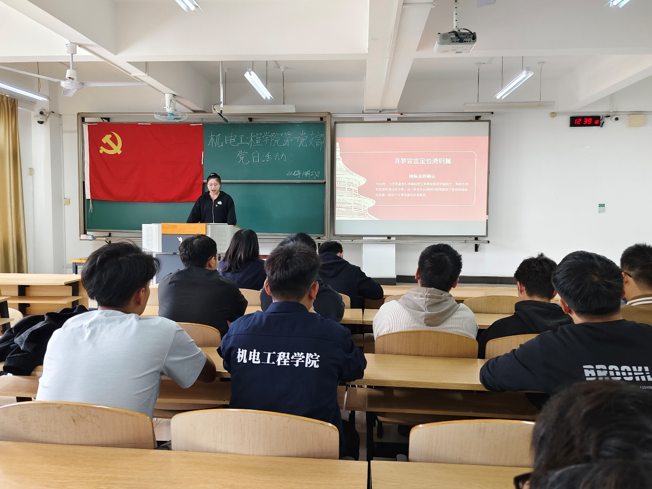 为深入学习贯彻习近平新时代中国特色社会主义思想,落实立德树人根本任务,传承红色基因、厚植家国情怀,引导青年党员深刻认识台湾光复的历史意义,增强维护国家主权与领土完整的责任感和使命感,10月29日,机电工程学院学生第一党支部在南校区飞天楼207,以“从抗战胜利到国家统一——传承红色基因”为主题,开展台湾光复历史专题学习党日活动。支部全体党员参会。